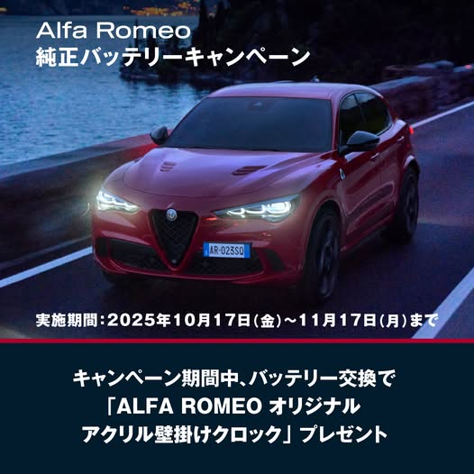 只今、車のパフォーマンスを100%引き出す「Alfa Romeo純正バッテリーキャンペーンを開催中です!